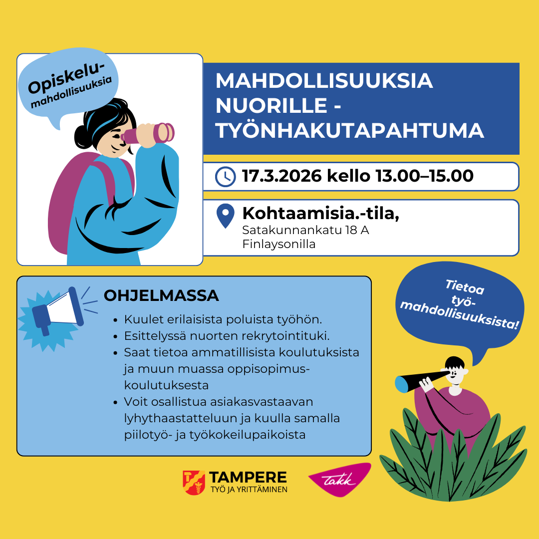 Tapahtuman järjestää Tampereen kaupungin työllisyys- ja kasvupalvelut yhdessä Tampereen aikuiskoulutuskeskus TAKKin kanssa. Tilaisuus on velvoittava.
