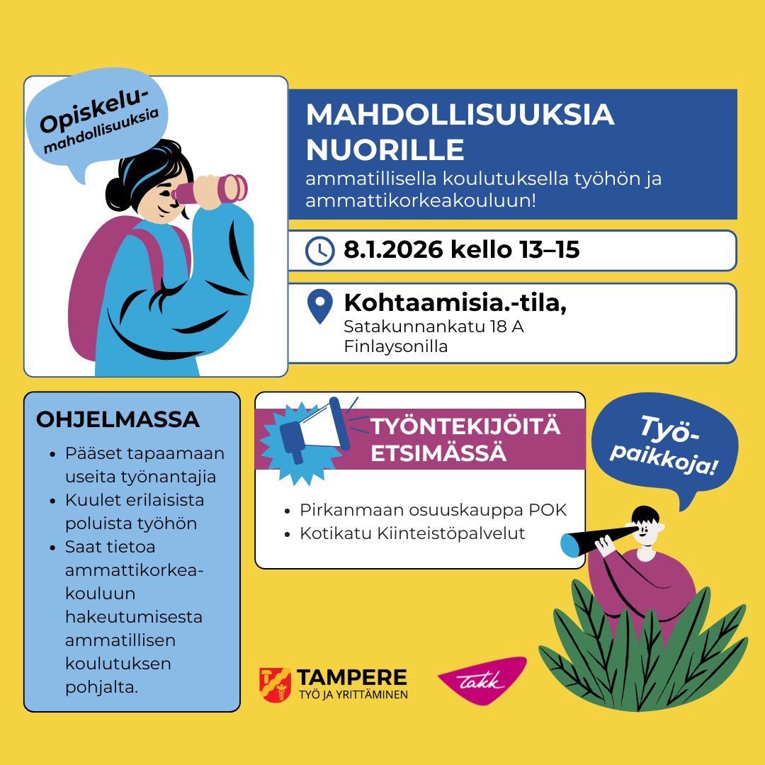 Tapahtuman järjestää Tampereen kaupungin työllisyys- ja kasvupalvelut yhdessä Tampereen aikuiskoulutuskeskus TAKKin kanssa. Tilaisuus on velvoittava.